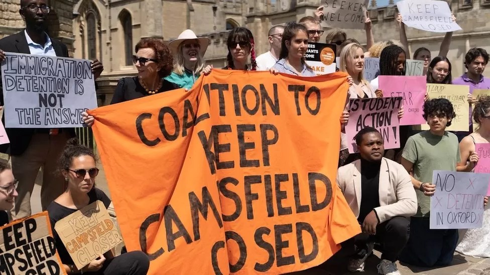 The immigration removal centre at Campsfield House reopened on Wednesday. Campaigners protested in Kidlington and Oxford, with 50 people gathering at Carfax in what organisers described as “a sombre event, a kind of vigil”.