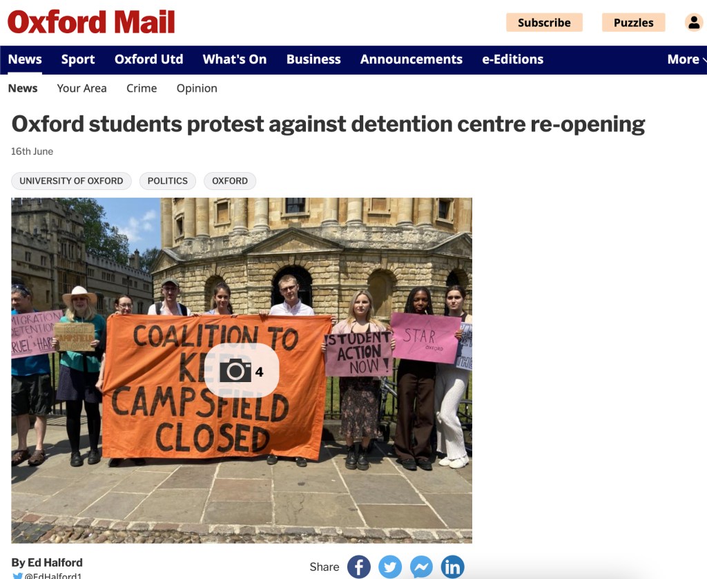 On Friday 16th June demonstrators gathered at Radcliffe Camera in Oxford to protest the reopening of Campsfield House Detention Centre. It also coincided with the launch of an open letter opposing the plans signed by more than 140 students and staff from Oxford University.